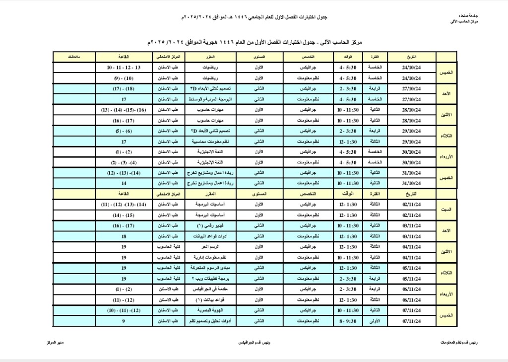 جدول اختبارات الفصل الأول من العام 1446 هجرية الموافق 2024/ 2025م