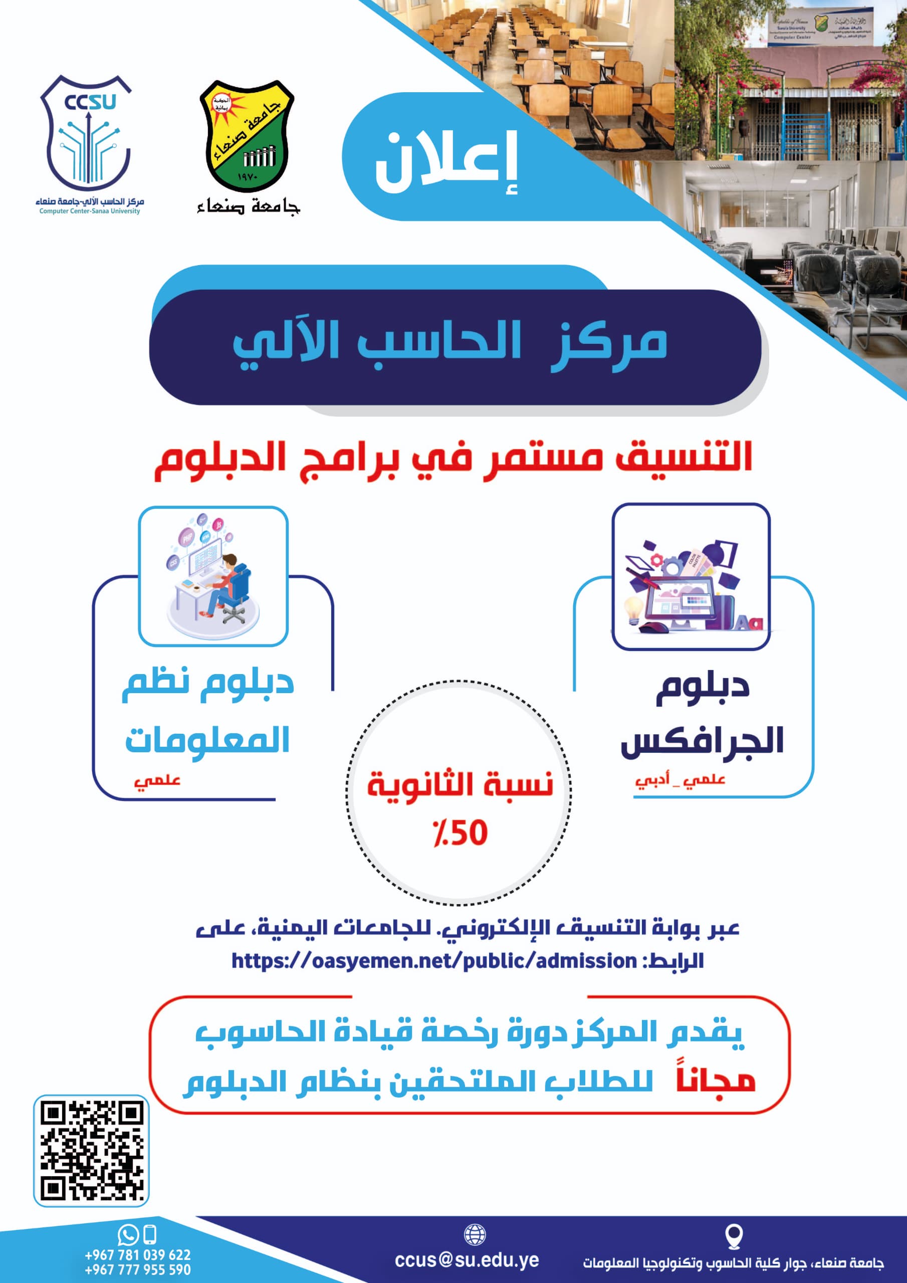 يعلن مركز الحاسب الآلي – جامعة صنعاء عن استمرار عملية التنسيق والقبول في جميع برامج الدبلوم للعام الجامعي 1447 هـ الموافق 2025-2026م.