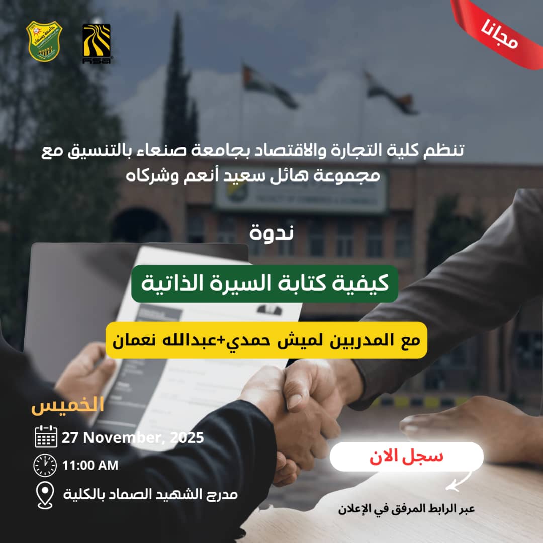 تنظم كلية التجارة والاقتصاد – جامعة صنعاء بالتنسيق مع مجموعة هائل سعيد أنعم وشركاه، ندوة تطبيقية بعنوان: كيفية كتابة السيرة الذاتية
