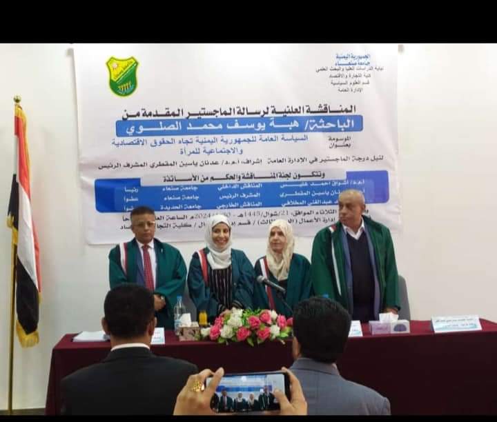 المناقشة العلنية لرسالة الماجستير بعنوان السياسة العامة للجمهورية اليمنية تجاه الحقوق الاقتصادية والاجتماعية للمرأة التصنيفات الأخبار Date مايو 1, 2024 شارك:المناقشة العلنية لرسالة الماجستير الموسومةبعنوان السياسة العامة للجمهورية اليمنية تجاه الحقوق الاقتصادية والاجتماعية للمرأة للباحثة/ هبة يوسف محمد الصلوي شارك: mbeshr المقال السابق كشوفات توزيع الطلاب في مركز الاختبار الالكتروني لمادة القانون التجاري النظامين العام والموازي مايو 1, 2024 المقال التالي كشوفات توزيع الطلاب في مركز الاختبار الالكتروني لاختبارات يوم السبت 4مايو2024 مايو 2, 2024 You may also like قسم إدارة الأعمال يعقد سمنارا علميا لمناقشة خطة اطروحة دكتوراه 9 مارس, 2026 كلية التجارة والاقتصاد تنظم ورشة تدريبية لأعضاء هيئة التدريس حول استراتيجيات التعليم والتعلم 16 فبراير, 2026 إعــــــــــــــــــــلان مناقشة علنية لرسالة ماجستير 16 فبراير, 2026