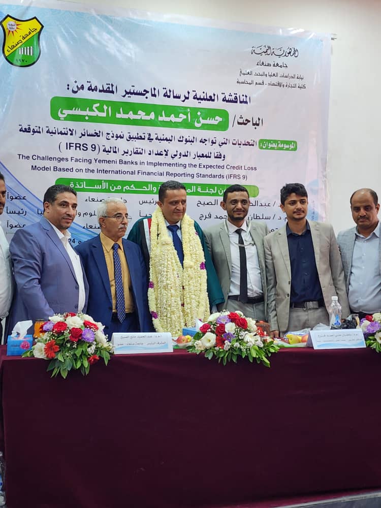 وبعد عرض الباحث حسن الكبسي رسالته التي قدمها بعنوان “التحديات التي تواجه البنوك اليمنية في تطبيق نموذج الخسائر الائتمانية المتوقعة وفقًا للمعيار الدولي لإعداد التقارير المالية (IFRS9)”، ومناقشته من قبل لجنة المناقشة والحكم، قررت اللجنة منحه درجة الماجستير في المحاسبة بتقدير ممتاز.