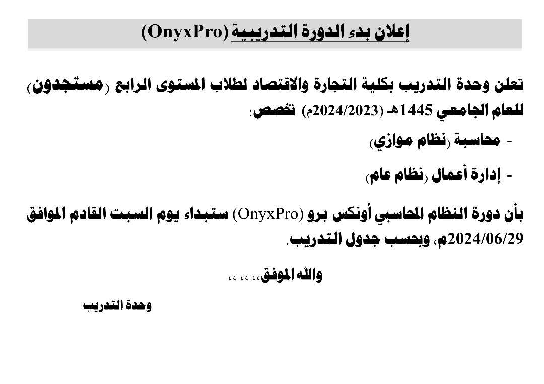 عن بداء دورة النظام المحاسبي (الأونكس برو) يوم السبت القادم الموافق 29-6-2024م بحسب جدول التدريب