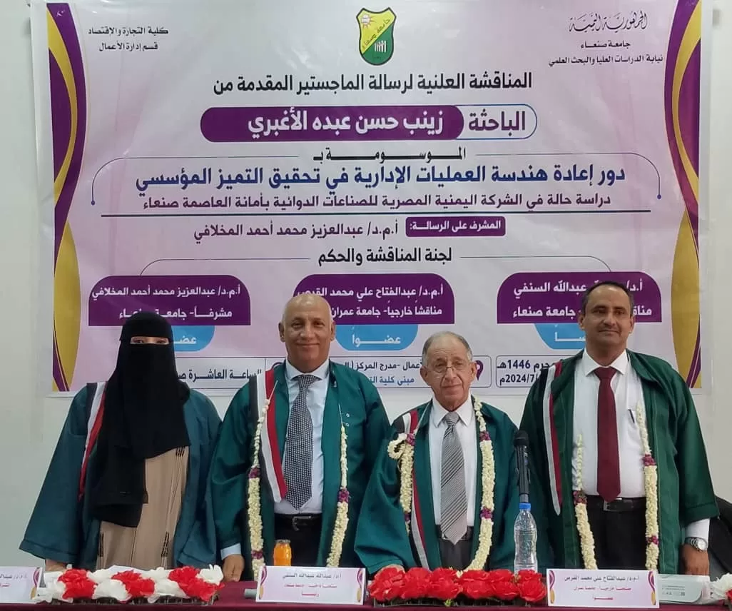 نالت الباحثة زينب حسن عبده الأغبري ، درجة الماجستير وحصلت على تقدير امتياز بدرجة 95٪ عن رسالتها المقدمة للمناقشة العلنية اليوم الأحد 14/7/2024م، بعنوان ” دور إعادة هندسة العمليات الإدارية في تحقيق التميز المؤسسي دراسة حالة في الشركة اليمنية المصريةللصناعات الدوائيةبأمانة العاصمة صنعاء “.
