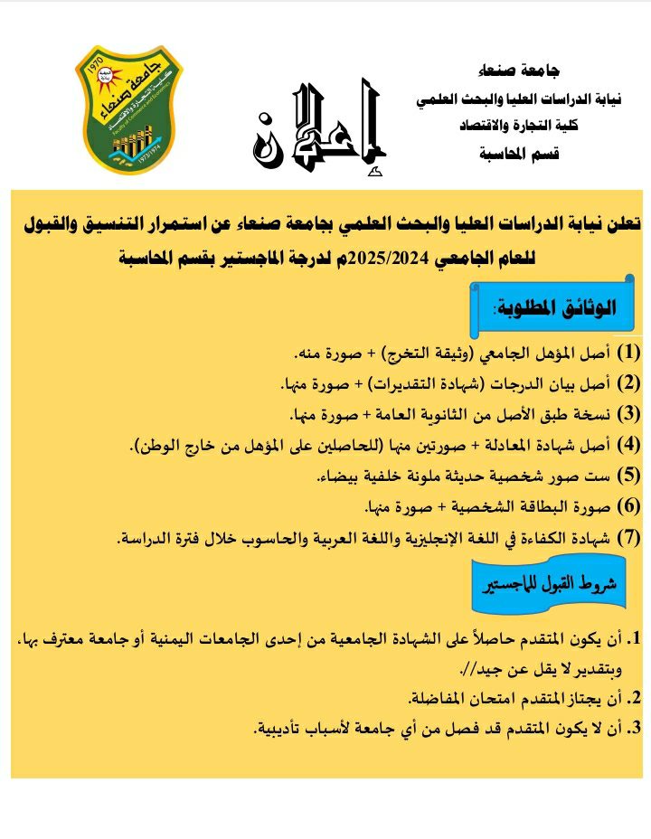إعلان للدراسات العليا عن متطلبات التنسيق والقبول في برنامج الماجستير في المحاسبة التصنيفات الأخبار Date يوليو 24, 2024 شارك:تعلن نيابة الدراسات العليا والبحث العلمي بجامعة صنعاء عن استمرار التنسيق والقبول للعام الجامعي 2024-2025م لدرجة الماجستير بقسم المحاسبة شارك: mbeshr المقال السابق اختبارات طلبة تمهيدي ماجستير قسم العلوم السياسية يوليو 24, 2024 المقال التالي المناقشة العلنية لرسالة ماجستير المقدمة من الباحثة سبا سلطان سيف علوي يوليو 24, 2024 You may also like قسم إدارة الأعمال يعقد سمنارا علميا لمناقشة خطة اطروحة دكتوراه 9 مارس, 2026 كلية التجارة والاقتصاد تنظم ورشة تدريبية لأعضاء هيئة التدريس حول استراتيجيات التعليم والتعلم 16 فبراير, 2026 إعــــــــــــــــــــلان مناقشة علنية لرسالة ماجستير 16 فبراير, 2026