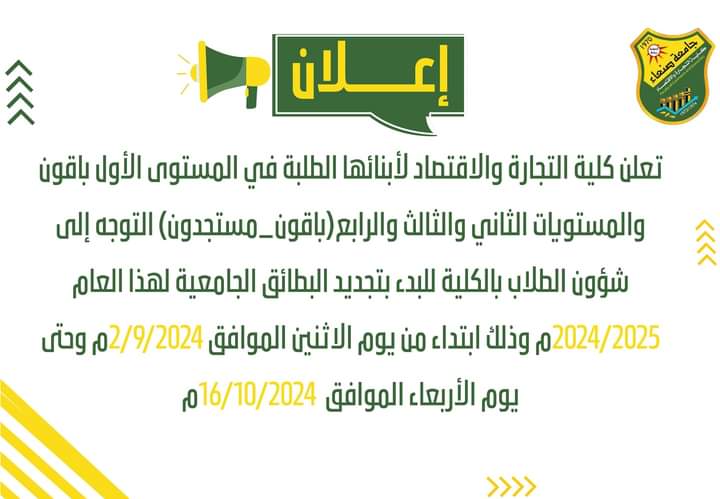 إعـــــــــــــــــــــــــــــــلان التصنيفات الأخبار Date سبتمبر 1, 2024 شارك: شارك: mbeshr المقال السابق كشوفات رقم 51بالشهادات الجاهزة للعام 2023م سبتمبر 1, 2024 المقال التالي عميد الكلية يشارك فريق الاعتماد المؤسسي بالكلية اعماله سبتمبر 3, 2024 You may also like قسم إدارة الأعمال يعقد سمنارا علميا لمناقشة خطة اطروحة دكتوراه 9 مارس, 2026 كلية التجارة والاقتصاد تنظم ورشة تدريبية لأعضاء هيئة التدريس حول استراتيجيات التعليم والتعلم 16 فبراير, 2026 إعــــــــــــــــــــلان مناقشة علنية لرسالة ماجستير 16 فبراير, 2026