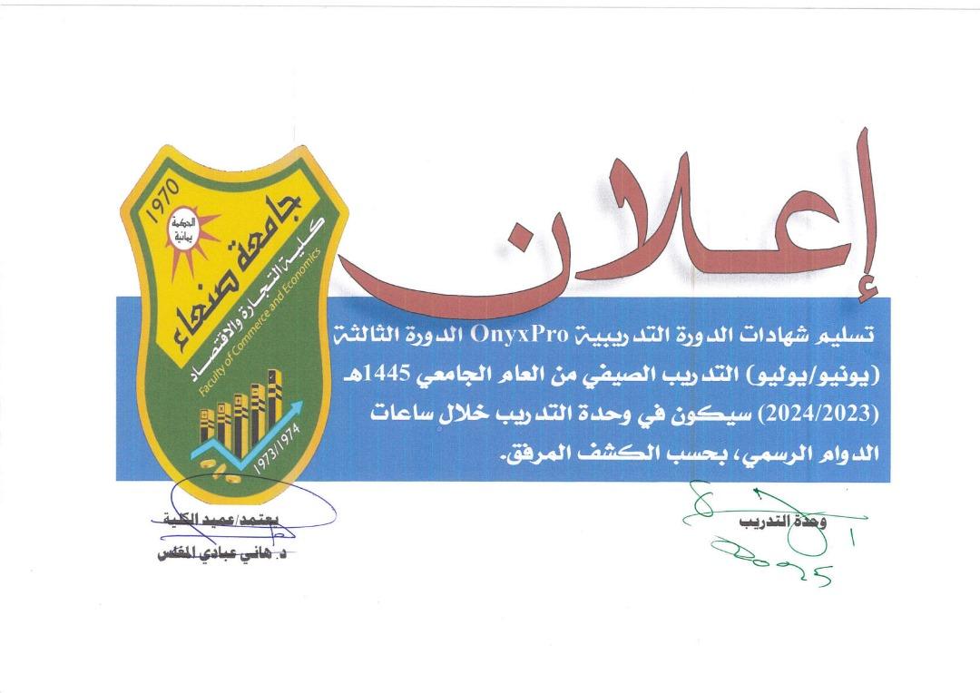 بدء تسليم شهادات الدورة التدريبية الثالثة OnyxPro (يونيو/ يوليو 2024) التصنيفات اعلانات خدمات الطلاب Date يناير 13, 2025 شارك:تحميل كشف رقم 1 تحميل كشف رقم 2 شارك: كلية التجارة والإقتصاد جامعة صنعاء المقال السابق زيارة عمادة الكلية لشركة يمن سوف يناير 13, 2025 المقال التالي في إطار خطة التدريب والتأهيل لموظفي كلية التجارة والاقتصاد يناير 15, 2025 You may also like بدء تسليم شهادات الأونكس برو للدورة الثالثة (مايو يوليو) 2024- 2025 (1446) التسليم بحسب الكشوفات المرفقة 16 فبراير, 2026 اعلاااان نتائج التظلمات للطلاب والطالبات لمواد الفصل الاول للعام الجامعي 2025 -2026م 11 فبراير, 2026 دليــــــــل اللجان الامتحانية للفصل الثاني من العام 1447هـ /2025-2026م 11 فبراير, 2026