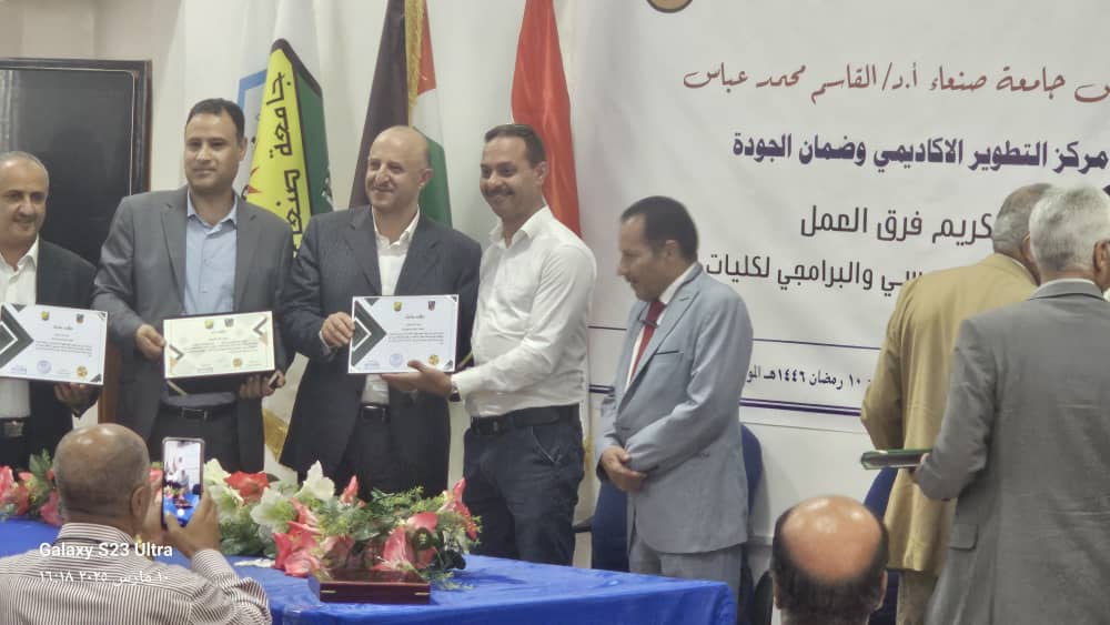 صور من حفل تكريم فريق الاعتماد المؤسسي بالكلية وتسليم عميد الكلية الدكتور هاني المغلس ونائب العميد لضمان الجودة الدكتورة عبير الوجيه “درع الجودة” من قبل الأستاذ الدكتور القاسم محمد عباس رئيس الجامعة والدكتورة هدى العماد عميد مركز التطوير وضمان الجودة بالجامعة بمناسبة حصول الكلية على الاعتماد المؤسسي الوطني الماسي.