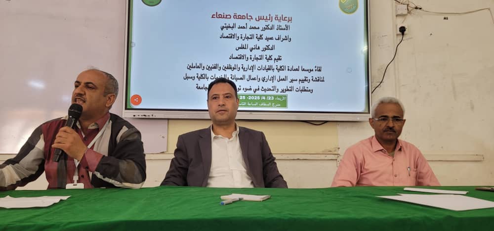 برعاية رئيس جامعة صنعاء الأستاذ الدكتور محمد أحمد البخيتي، عقد عميد كلية التجارة والاقتصاد الدكتور هاني المغلس صباح اليوم الأربعاء 22/ 4/ 2025 لقاءً بالقيادات الإدارية والموظفين والفنيين والعاملين لمناقشة وتقييم سير العمل الإداري واعمال الصيانة والخدمات بالكلية وسبل ومتطلبات التطوير والتحديث في ضوء توجهات رئاسة الجامعة.
