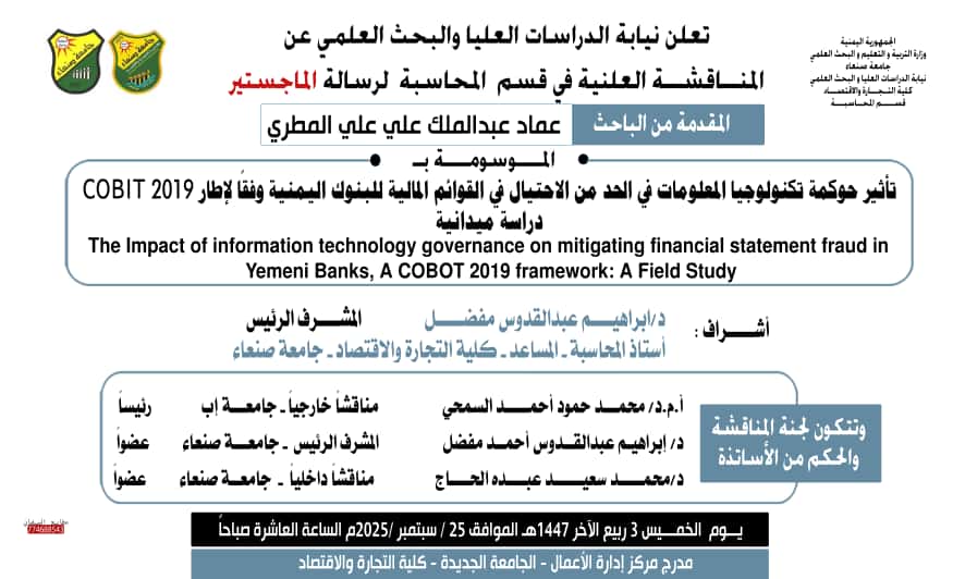 مناقشة علنية لرسالة الماجستير في قسم المحاسبة التصنيفات الأخبار Date سبتمبر 22, 2025 شارك: شارك: كلية التجارة والإقتصاد جامعة صنعاء المقال السابق كشف بشهادات تخرج رقم 25 للعام (2023-2024) يونيو+اكتوبر سبتمبر 22, 2025 المقال التالي كلية التجارة والاقتصاد تنظم ندوة عن ثورة 21 سبتمبر ودورها في نصرة فلسطين وإسناد المقاومة سبتمبر 23, 2025 You may also like قسم إدارة الأعمال يعقد سمنارا علميا لمناقشة خطة اطروحة دكتوراه 9 مارس, 2026 كلية التجارة والاقتصاد تنظم ورشة تدريبية لأعضاء هيئة التدريس حول استراتيجيات التعليم والتعلم 16 فبراير, 2026 إعــــــــــــــــــــلان مناقشة علنية لرسالة ماجستير 16 فبراير, 2026