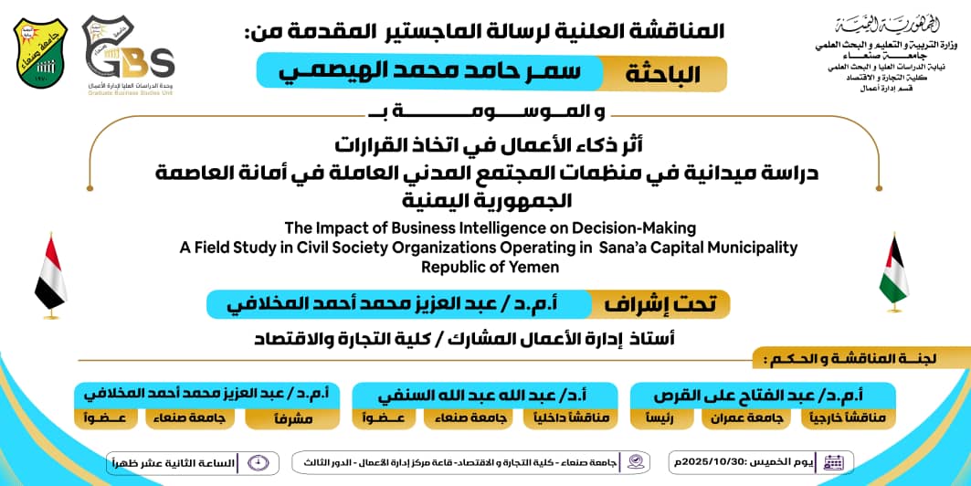 مناقشة علنية لرسالة ماجستير التصنيفات الأخبار Date أكتوبر 29, 2025 شارك: شارك: كلية التجارة والإقتصاد جامعة صنعاء المقال السابق كشف بشهادات تخرج رقم 1 للعام (2024-2025) يونيو+اكتوبر أكتوبر 29, 2025 المقال التالي كشف بشهادات تخرج رقم 2 للعام (2024-2025) يونيو+اكتوبر نوفمبر 1, 2025 You may also like قسم إدارة الأعمال يعقد سمنارا علميا لمناقشة خطة اطروحة دكتوراه 9 مارس, 2026 كلية التجارة والاقتصاد تنظم ورشة تدريبية لأعضاء هيئة التدريس حول استراتيجيات التعليم والتعلم 16 فبراير, 2026 إعــــــــــــــــــــلان مناقشة علنية لرسالة ماجستير 16 فبراير, 2026