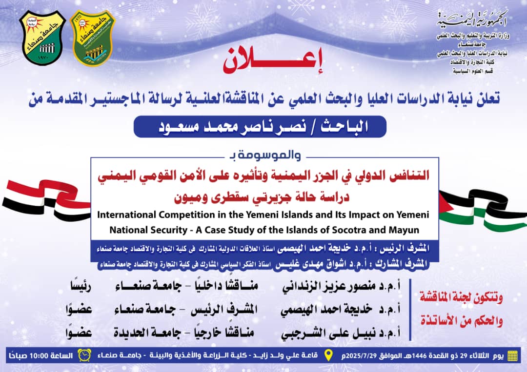 تعلن نيابة الدراسات العليا والبحث العلمي بجامعة صنعاء عن المناقشة العلنية لرسالة الماجستير المقدمة من الباحث/ عبد المحسن عبد الله قاسم طاوس، قسم العلوم السياسية كلية التجارة والاقتصاد عن رسالته الموسومة بـ : التوظيف السياسي للمساعدات الأمريكية في الجمهورية اليمنية، …