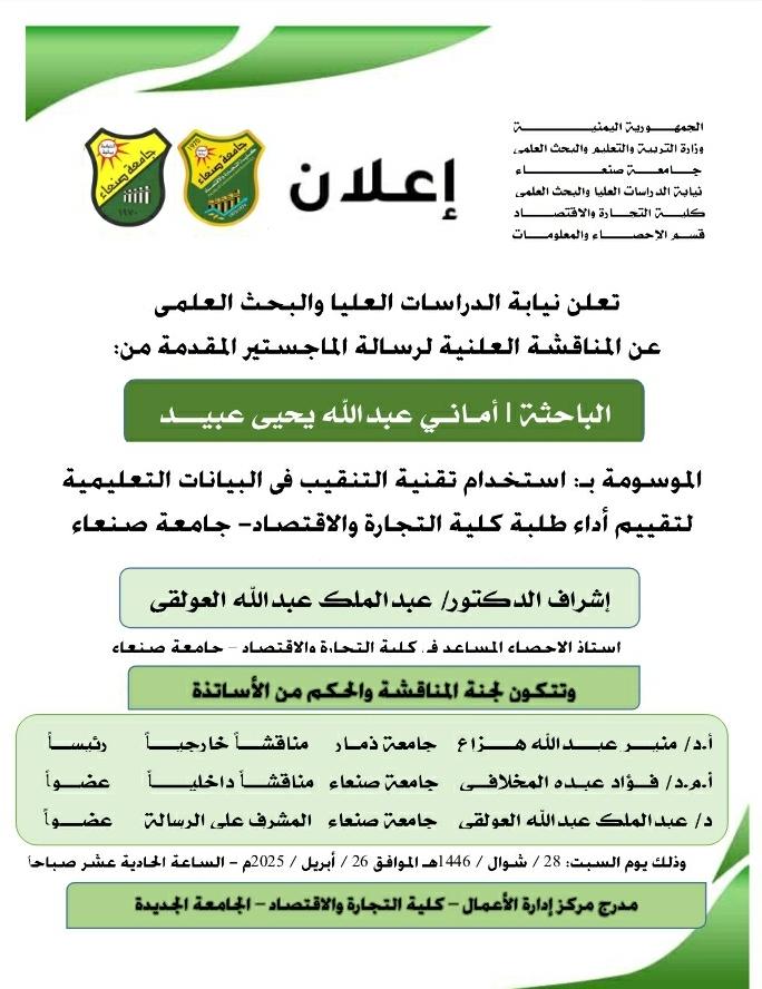 المناقشة العلنية لرسالة الماجستير المقدمة من الباحثة/ أماني عبدالله يحيى …
