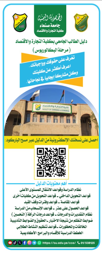 The Faculty of Commerce and Economics at Sana’a University has launched the electronic version of its Undergraduate Student Guide on its official website, coinciding with the start of the second semester. The guide includes comprehensive information on study regulations, enrollment, attendance, transfer procedures, examinations, appeal processes, and graduation requirements.