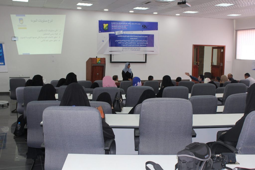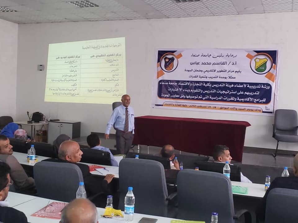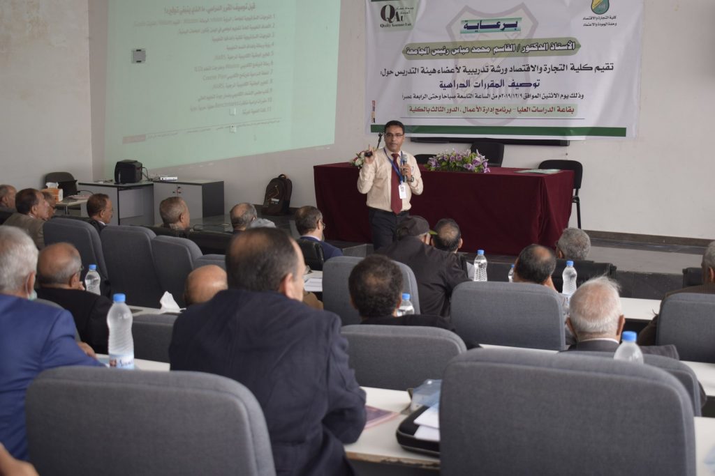 الورشة التدريبية حول استراتيجية التدريس و التقويم و بناء الاختبارات بكلية التجارة والاقتصاد أقامها مركز التطوير الأكاديمي و ضمان الجودة بالجامعة وبرعاية الأخ رئيس الجامعة ا.د/ القاسم محمد عباس