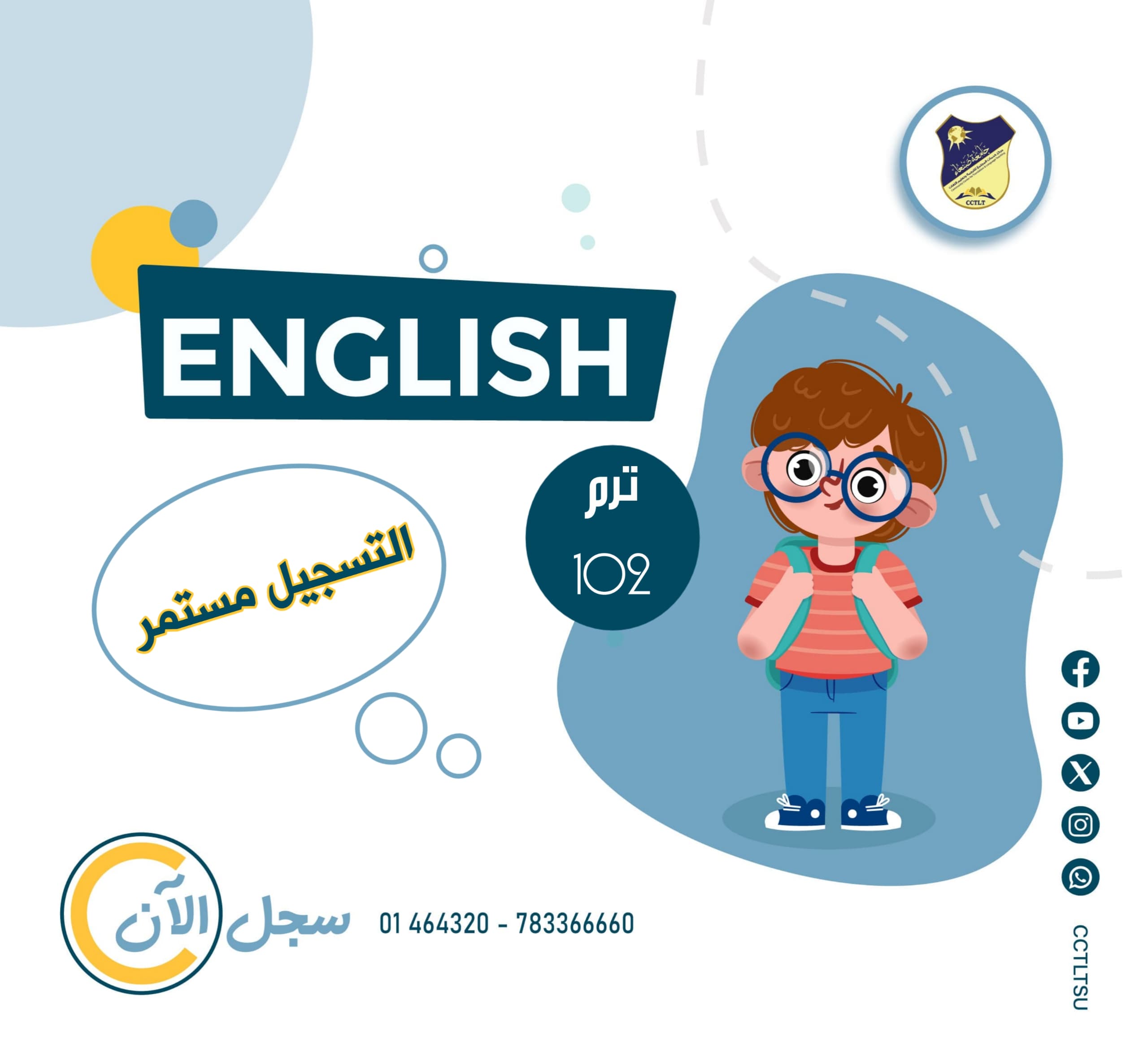 يعلن مركز خدمات المجتمع للترجمة وتعليم اللغات عن تمديد فترة التسجيل في برنامج اللغة الإنجليزية وبقية اللغات للترم 102 يومي السبت والأحد