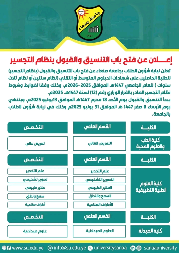 تُعلن نيابة شؤون الطلاب بجامعة صنعاء عن فتح باب التنسيق والقبول (بنظام التجسير) للطلبة الحاصلين على شهادات الدبلوم المتوسط أو التقني (نظام سنتين أو نظام ثلاث سنوات) للعام الجامعي 1447هـ الموافق 2025-2026م، وذلك وفقا لضوابط وشروط نظام التجسير الصادر بالقرار الوزاري رقم (12) لسنة 1447هـ ـ 2025م.