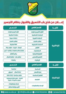 تُعلن نيابة شؤون الطلاب بجامعة صنعاء عن فتح باب التنسيق والقبول (بنظام التجسير) للطلبة الحاصلين على شهادات الدبلوم المتوسط أو التقني (نظام سنتين أو نظام ثلاث سنوات) للعام الجامعي 1447هـ الموافق 2025-2026م، وذلك وفقا لضوابط وشروط نظام التجسير الصادر بالقرار الوزاري رقم (12) لسنة 1447هـ ـ 2025م.