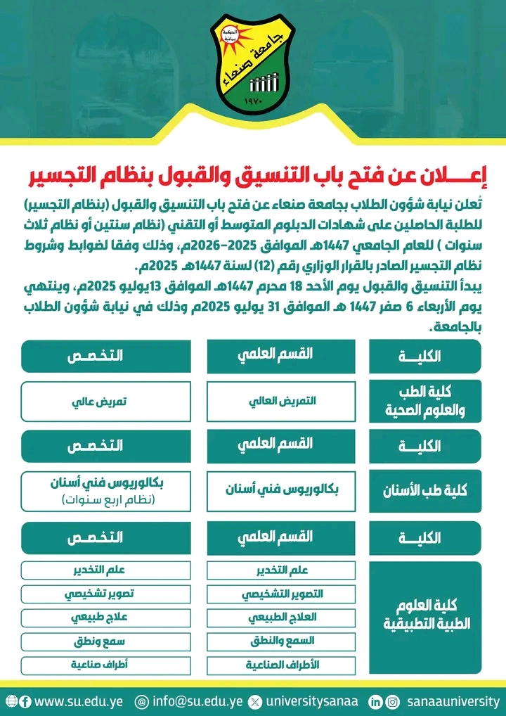 تُعلن نيابة شؤون الطلاب بجامعة صنعاء عن فتح باب التنسيق والقبول (بنظام التجسير) للطلبة الحاصلين على شهادات الدبلوم المتوسط أو التقني (نظام سنتين أو نظام ثلاث سنوات) للعام الجامعي 1447هـ الموافق 2025-2026م، وذلك وفقا لضوابط وشروط نظام التجسير الصادر بالقرار الوزاري رقم (12) لسنة 1447هـ ـ 2025م.