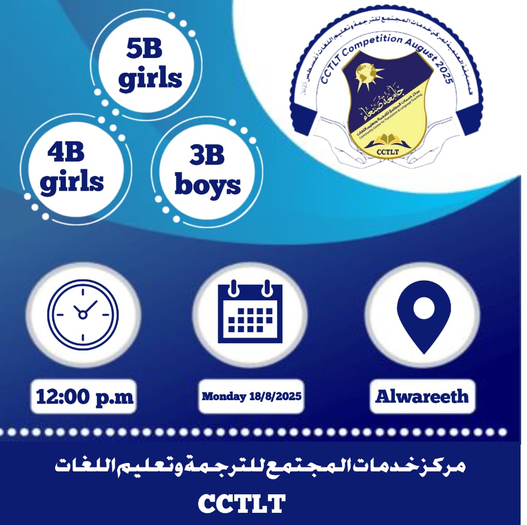 يعلن مركز خدمات المجتمع للترجمة وتعليم اللغات عن إقامة المسابقة النهائية بين طلاب وطالبات المستويات العليا في برنامج دورات اللغة الإنجليزية