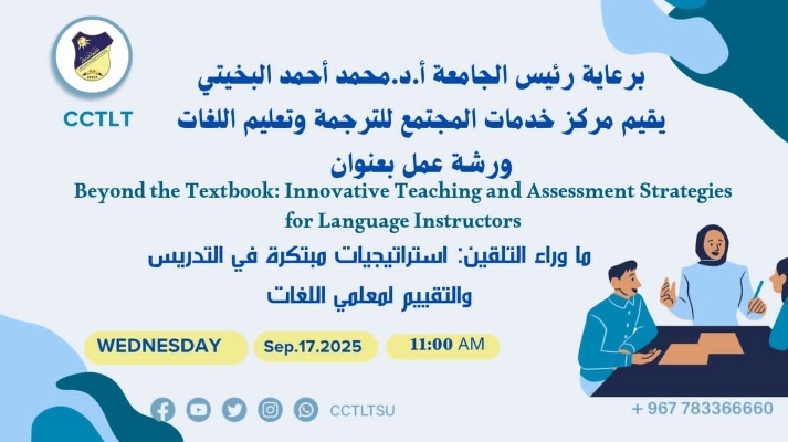 برعاية رئيس الجامعة أ.د. محمد أحمد البخيتي يقيم مركز خدمات المجتمع للترجمة وتعليم اللغات -جامعة صنعاء ورشة عمل بعنوان( ما وراء التلقين: استراتيجيات مبتكرة في التدريس والتقييم لمعلمي اللغات)