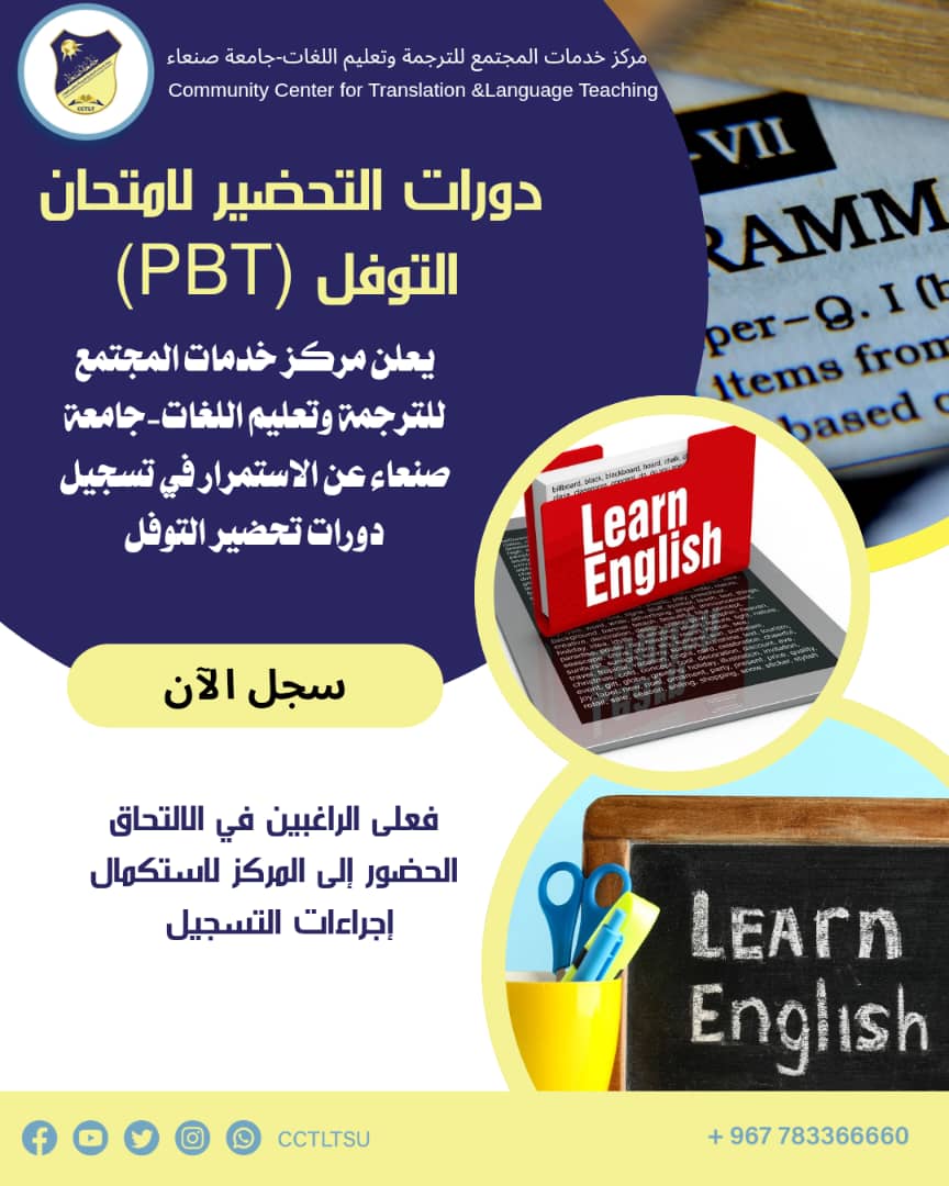 يعلن مركز خدمات المجتمع للترجمة وتعليم اللغات-جامعة صنعاء عن استمرار التسجيل في دورات تحضير امتحان التوفل(PBT).