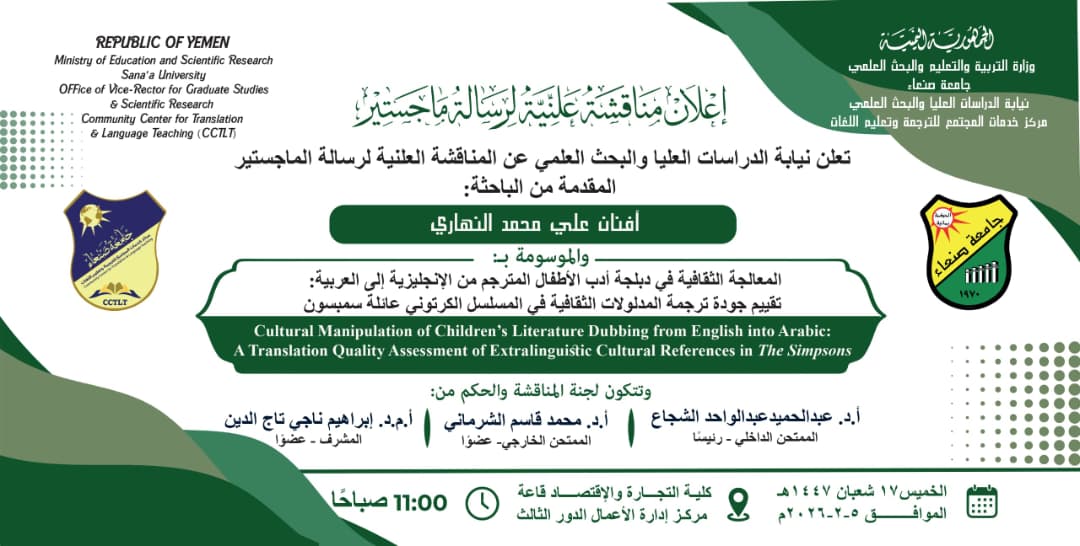 أفنان علي محمد النهاري ،قسم الترجمة – بمركز خدمات المجتمع للترجمة وتعليم اللغات عن رسالتها الموسومة بـ(المعالجة الثقافية في دبلجة ادب الأطفال المترجم من الإنجليزية إلى العربية: تقييم جودة ترجمة المدلولات الثقافية في المسلسل الكرتوني عائلة سمبسون).