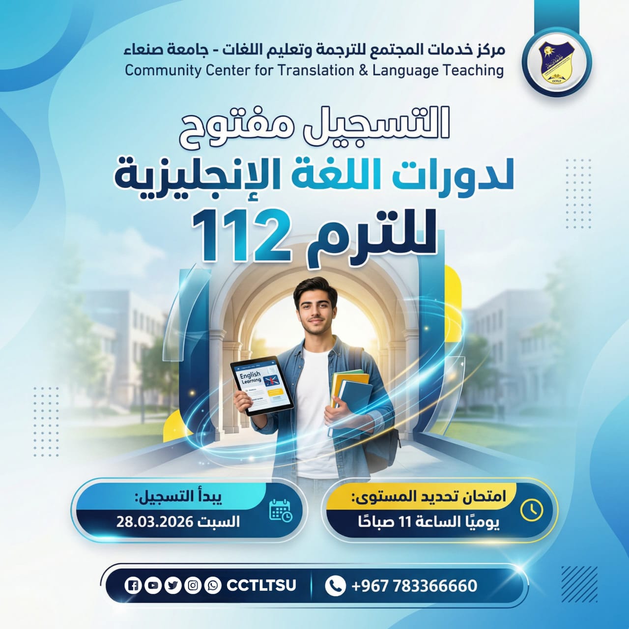 يعلن مركز الترجمة وتعليم اللغات جامعة صنعاء عن استمرار التسجيل في برنامج دورات تعليم اللغة الإنجليزية للترم (112).