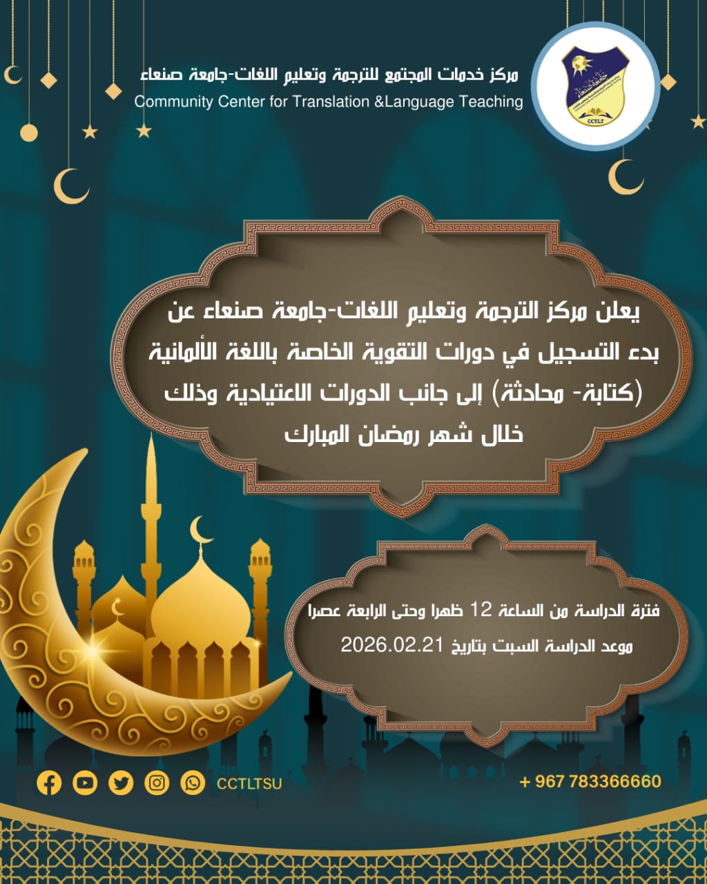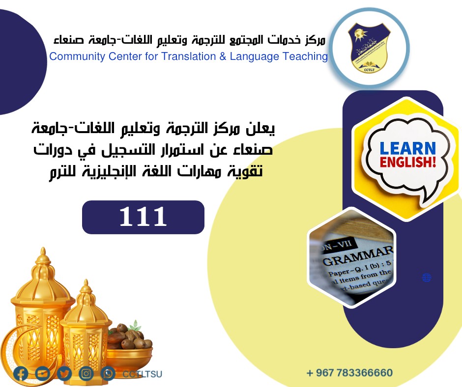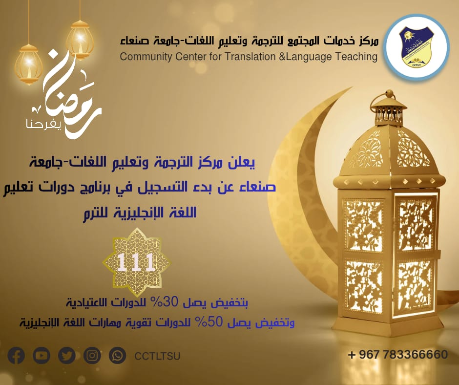 😍بشرى سارة يعلن مركز خدمات المجتمع للترجمة وتعليم اللغات-جامعة صنعاء عن بدء التسجيل في البرنامج الخاص بشهر رمضان المبارك للدورات اللغوية والتدريبية للترم(111) وبتخفيض يصل إلى 30% للدورات الاعتيادية، وتخفيض يصل إلى 50% لدورات تقوية مهارات اللغة الإنجليزية( القواعد- الكتابة- …