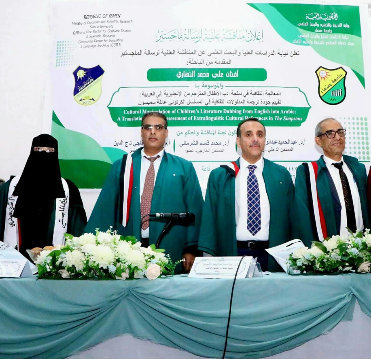 نالت الباحثة أفنان علي محمد أحمد النهاري درجة الماجستير في الترجمة من مركز خدمات المجتمع للترجمة وتعليم اللغات – جامعة صنعاء، وذلك بتقدير عام امتياز بنسبة (95%)، عن رسالتها الموسومة بـ: “المعالجة الثقافية في دبلجة أدب الأطفال المترجم من الإنجليزية …