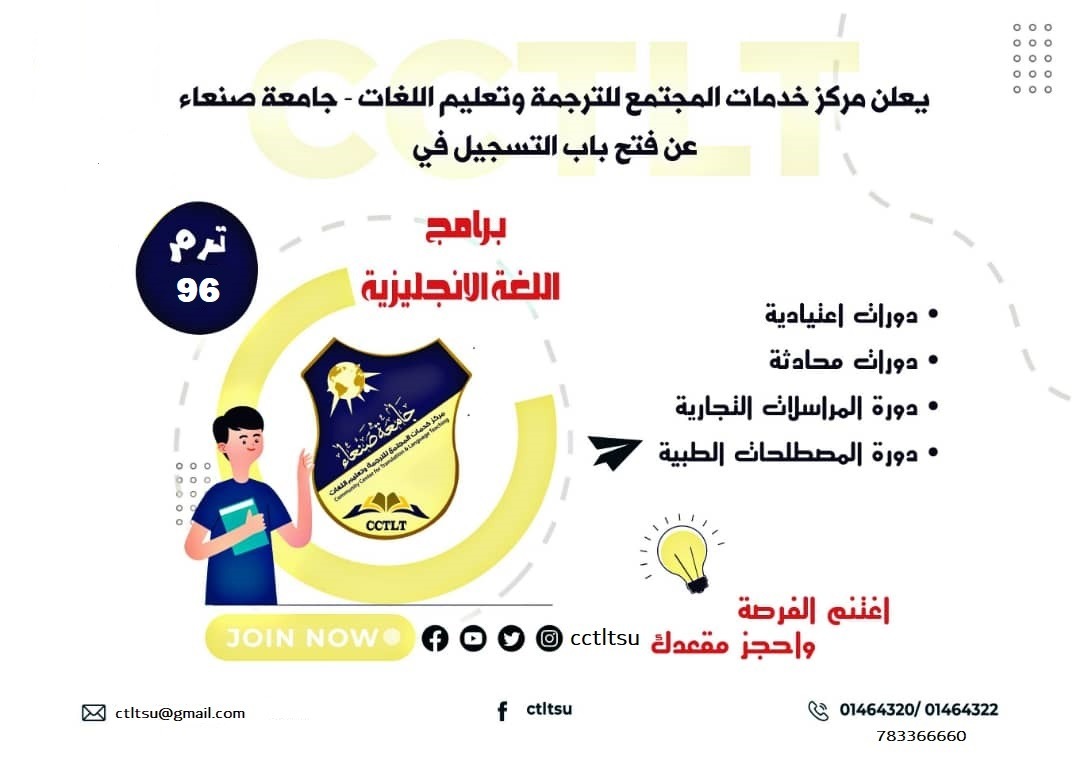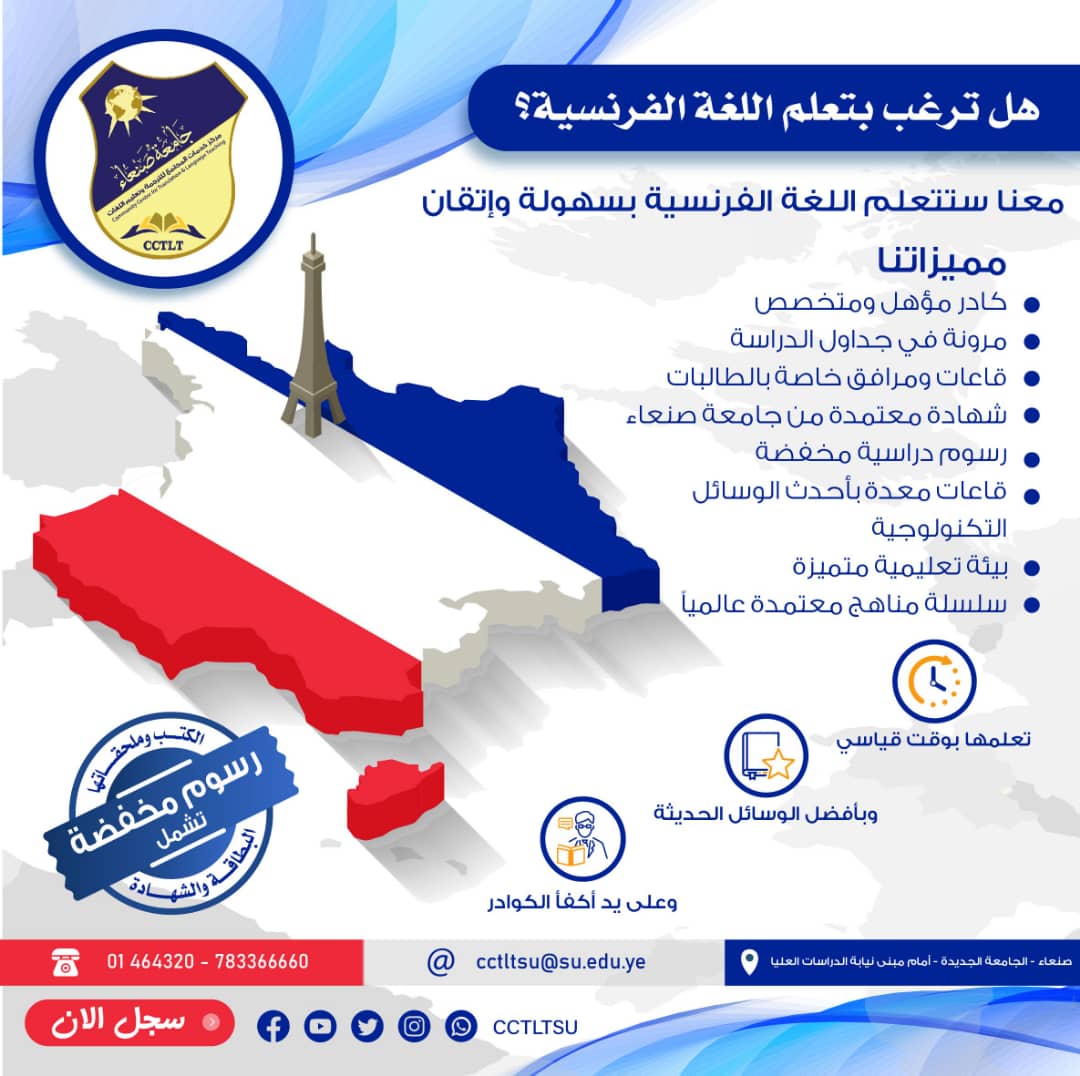 هل تحلم بالسفرإلى برج إيفل؟ لكنك لاتعرف اللغة الفرنسية😟 هل ترغب بتعلم اللغة الفرنسية بإتقان، ولدى كادر ذو كفاءة عالية، وبرسوم دراسية مخفضة؟ 😃😃 الآن يمكنك التسجيل ببرنامج تعليم اللغة الفرنسية في مركز الترجمة وتعليم اللغات جامعة صنعاء. 💫 مميزاتنا …