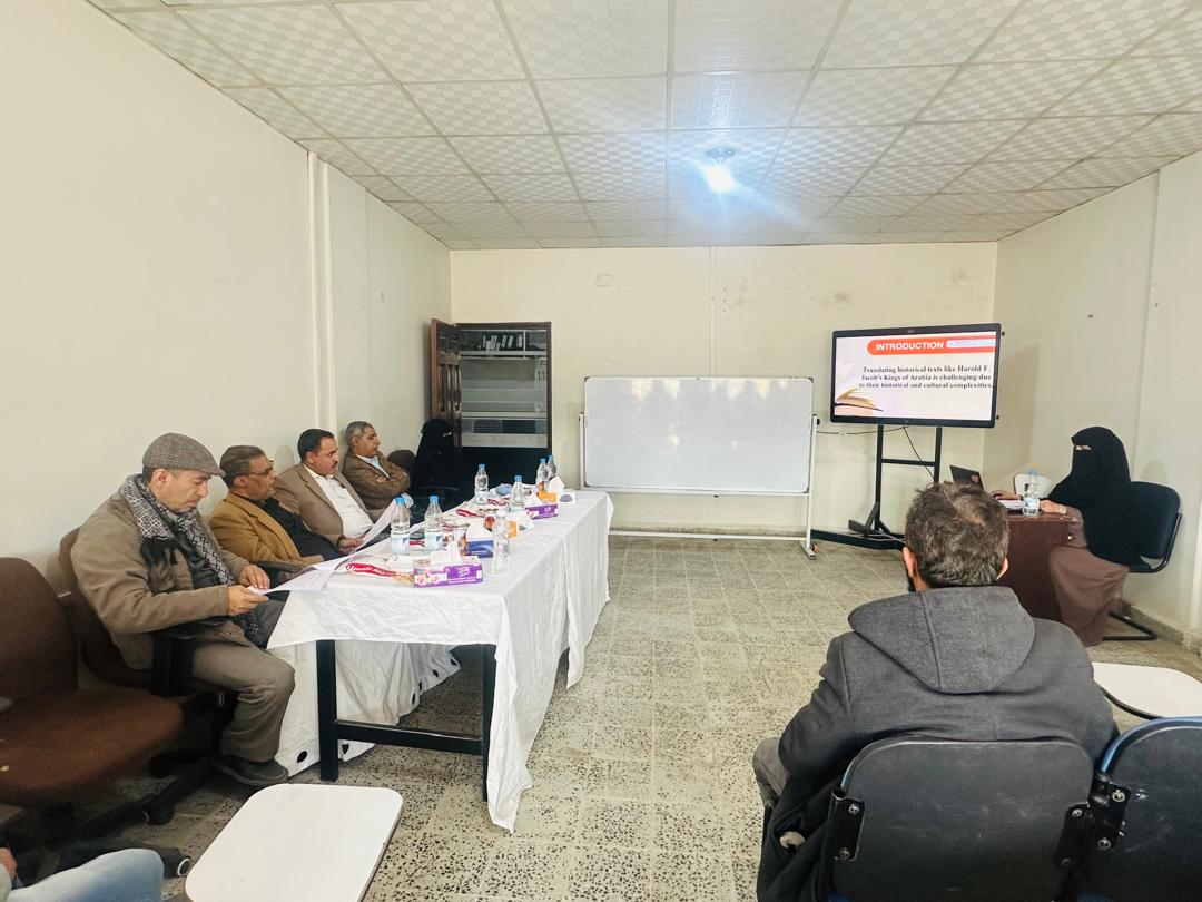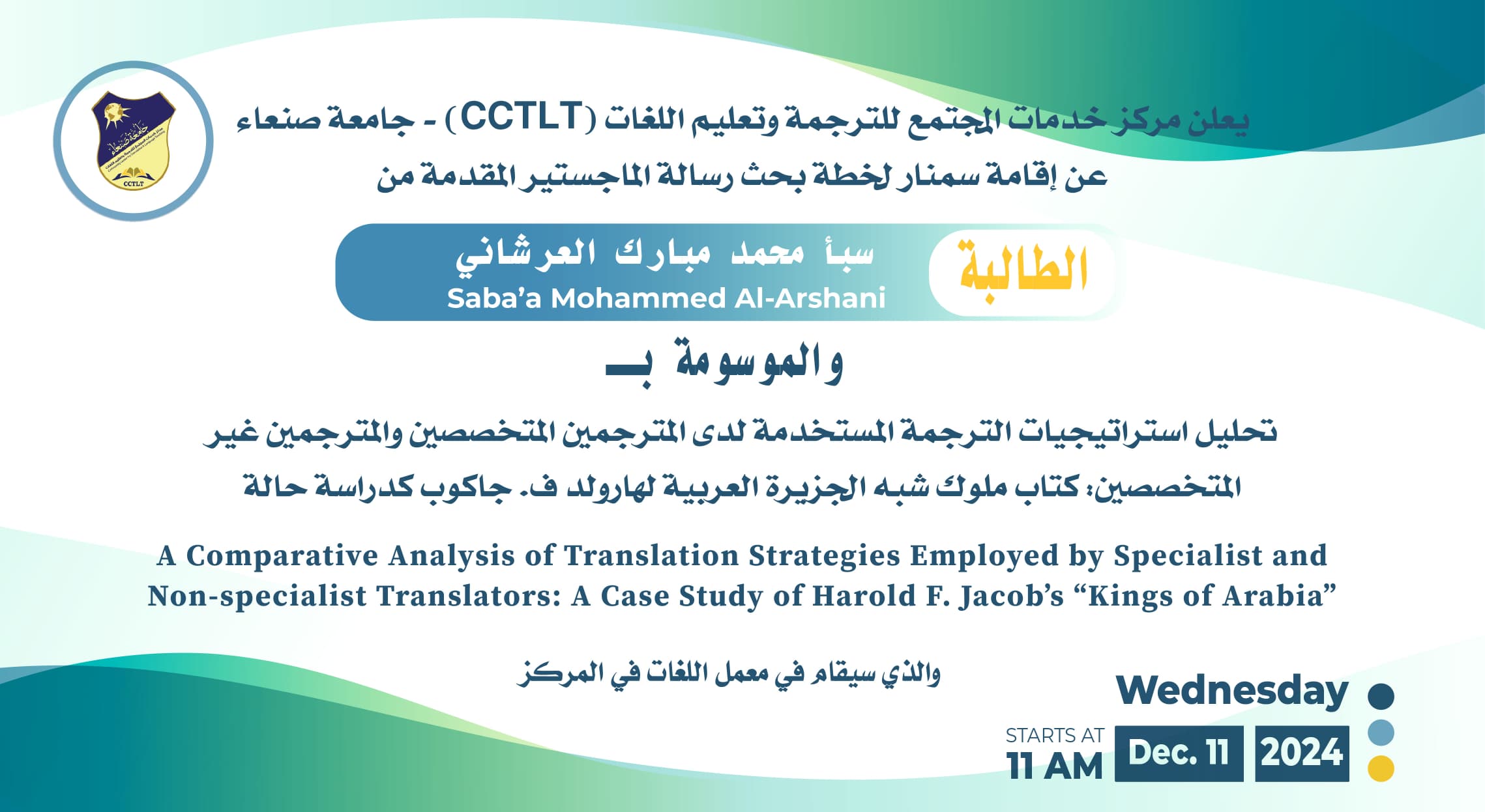 عقدت لجنة السمنار بقسم الترجمة وتطبيقاتها بالمركز اليوم الأربعاء بتاريخ 10/06/1446هـ الموافق 11/12/2024م سمنار لمناقشة خطة بحث الماجستير في الترجمة المقدمة من الباحثة/سبأ محمد مبارك العرشاني، الموسومة بعنوان: “تحليل استخدام استراتيجيات الترجمة لدى المترجمين المتخصصين والغير متخصصين: ترجمة كتاب “ملوك …