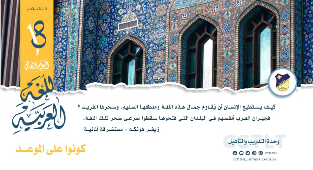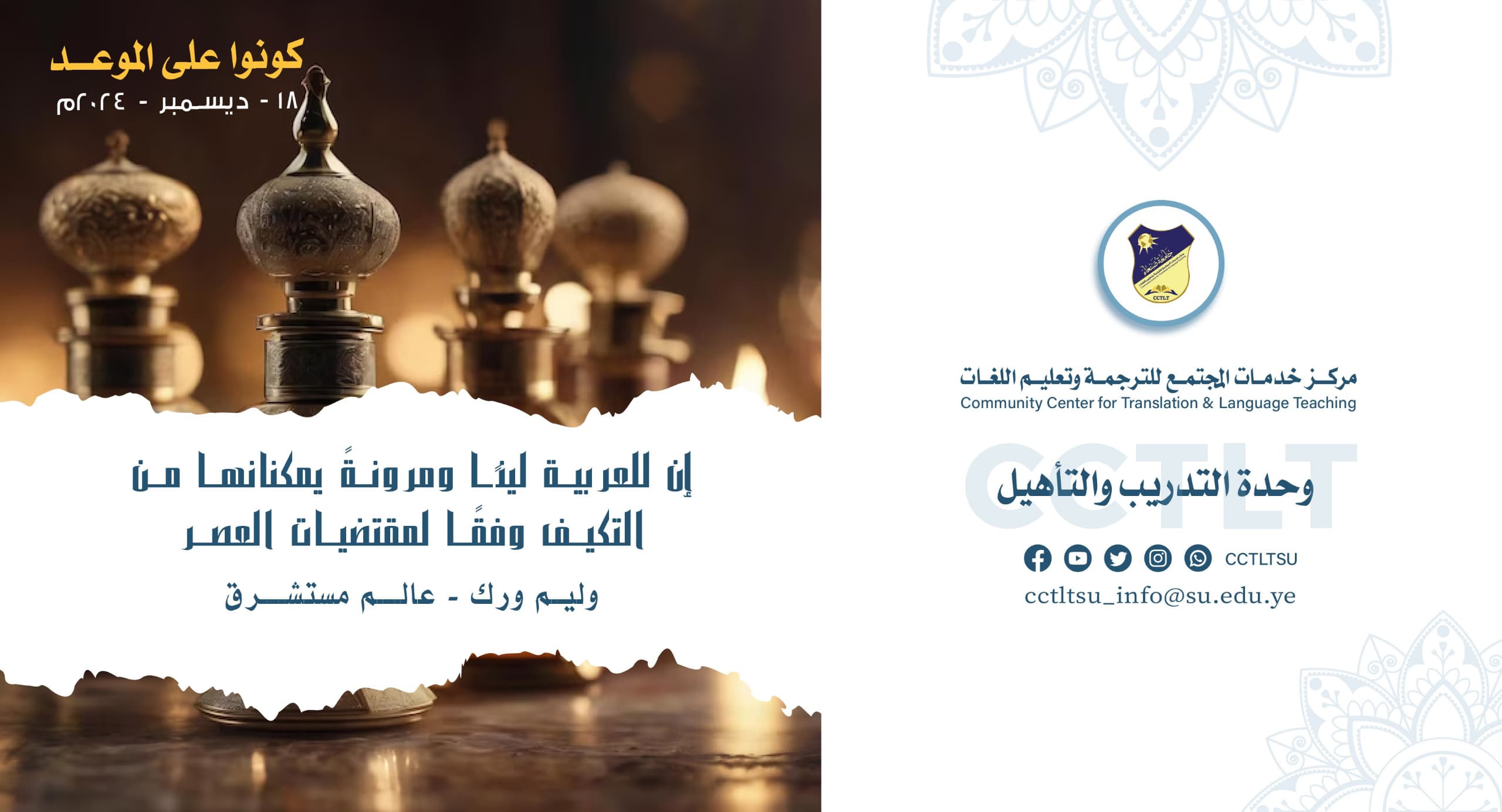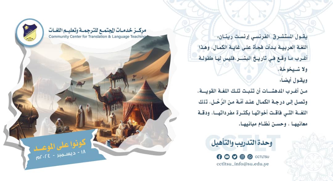 يسر مركز خدمات المجتمع للترجمة وتعليم اللغات دعوتكم لحضور ندوة علمية بمناسبة اليــوم العالمـي للغــة العربيــة، بعنوان “اللغة العربية وإشكاليات الترجمة” والتي يقدمها نخبة من الأكاديميين والمتخصصين في علوم اللغة واللسانيات انضموا إلينا لاكتشاف الجوانب الفريدة لهذه اللغة العريقة والتعرف …