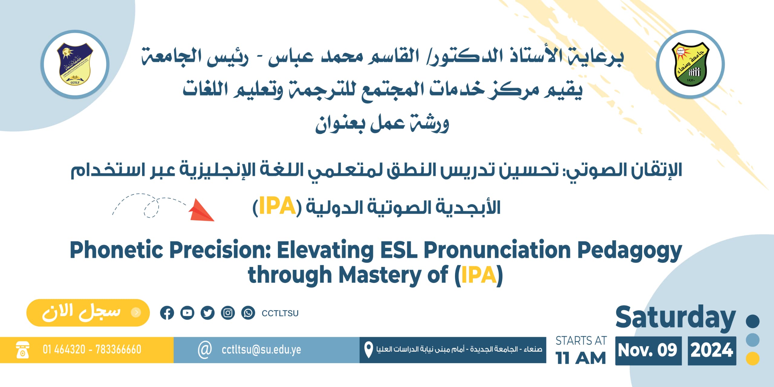 صنعاء – 9 نوفمبر 2024 تحت رعاية رئيس الجامعة، الأستاذ الدكتور القاسم محمد عباس، نظم مركز خدمات المجتمع للترجمة وتعليم اللغات ورشة عمل مكثفة لمدرسي قسم تعليم اللغات تحت عنوان “الإتقان الصوتي: تحسين تدريس النطق لمتعلمي اللغة الإنجليزية عبر استخدام …