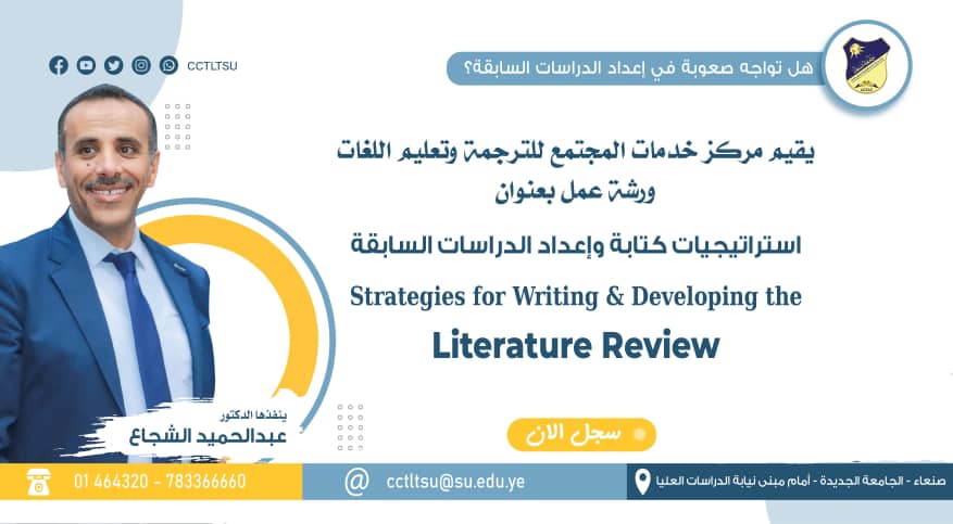 بشرى سارة 😃😃 نزولاً عند رغبة المسجلين في ورشة العمل الخاصة باستراتجيات كتابة وإعداد الدراسات السابقة، فقد تم تأجيل الورشة، وإقامتها يوم الخميس القادم بإذن الله بتاريخ 14/11/202 والتي ينظمها مركز الترجمة وتعليم اللغات جامعة صنعاء. ينفذها: أ.د/ عبدالحميد الشجاع …