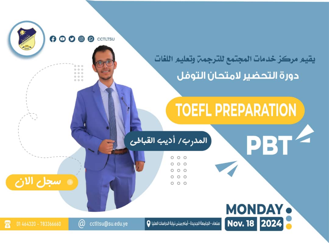 هل تحلم بالحصول على وظيفة مميزة؟ لكنك لم تحصل على شهادة التوفل؟ تريد الدراسة بشكل مكثف وبأوقات مناسبة؟ 😃😃الآن يمكنك الإلتحاق والتسجيل في دورة التحضير لامتحان التوفل في مركز الترجمة وتعليم اللغات جامعة صنعاء. سجل الآن واحجز مقعدكِ للأتصال: 01464320 …