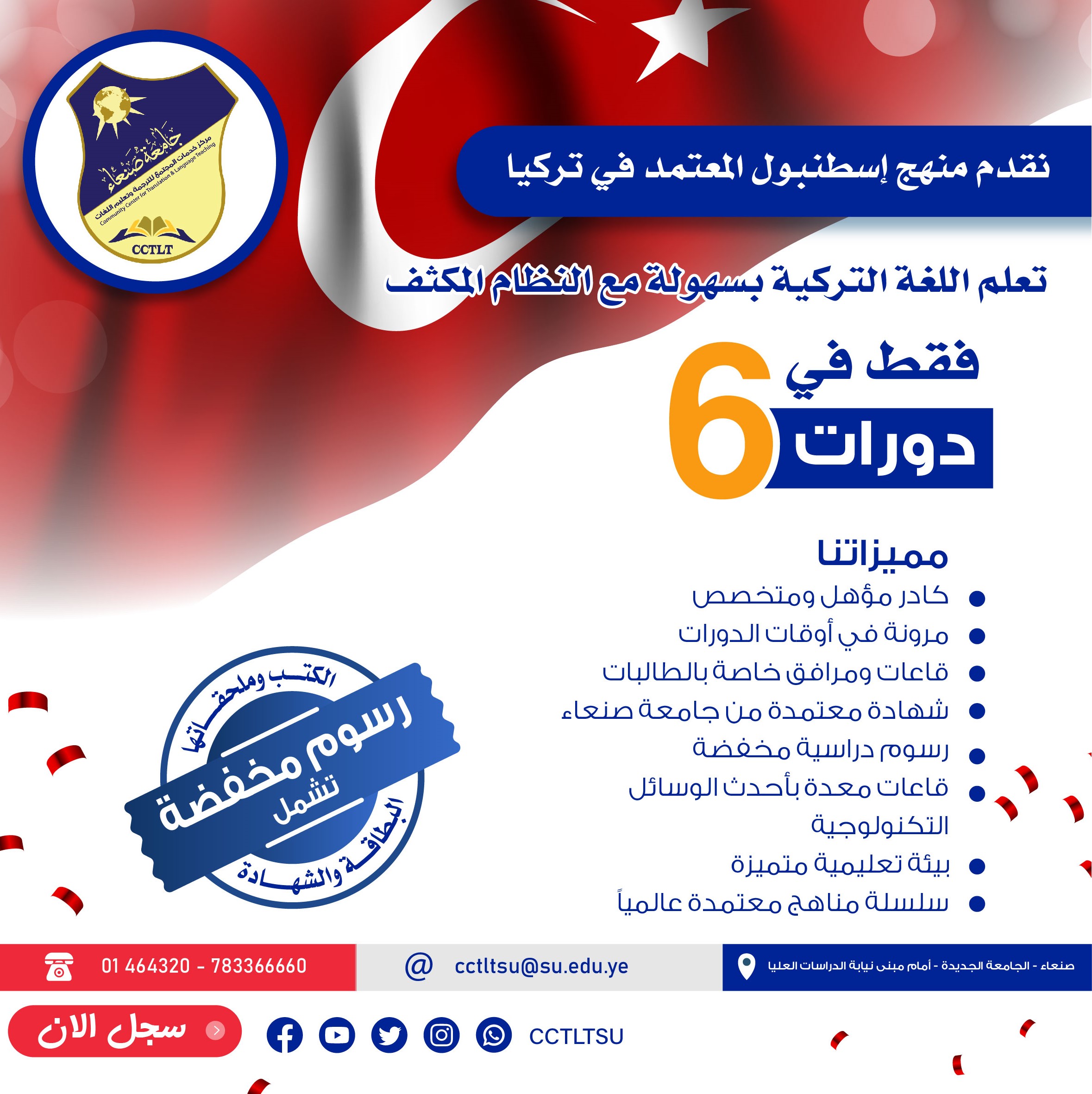 للاستفسار والتسجيل: ☎️ 464320 / 464322 📞 783366660 ✉️ cctltsu_info@su.edu.ye ✉️ ctltsu@gmail.com 📍العنوان: مركز الترجمة وتعليم اللغات – جامعة صنعاء الجديدة، أمام مبنى نيابة رئاسة الجامعة للدراسات العليا. ✍️ لا تفوت فرصتك… سجل الآن وابدأ رحلة التميز!