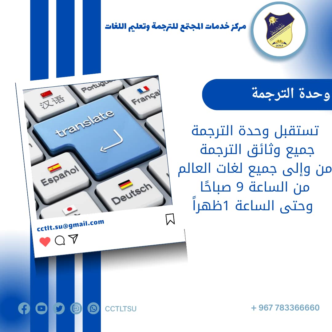 نسعد باستقبال وثائق الترجمة على مدار الساعة عبر الواتساب على الرقم: 783366660 للمزيد من المعلومات ، يرجى زيارة موقعنا الإلكتروني أو التواصل معنا عبر: ☎️ 464320 / 464322 📞 783366660 ✉️ cctltsu_info@su.edu.ye ✉️ ctltsu@gmail.com تابعونا على فيسبوك: https://www.facebook.com/ctltsu/ الموقع الإلكتروني: …