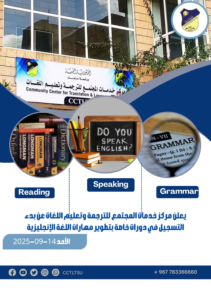 مركز خدمات المجتمع للترجمة وتعليم اللغات-جامعة صنعاء الجديدة أمام نيابة الدراسات العليا. 🕝11:00 صباحًا 📆17 سبتمبر 2025م