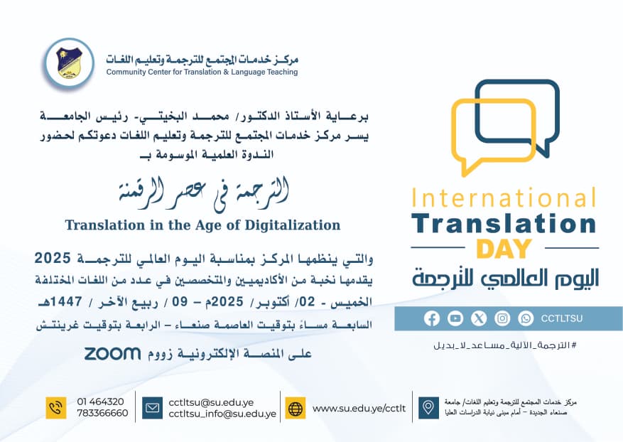 On the occasion of International Translation Day, the Community Center for Translation and Language Teaching (CCTLT) – Sana’a University – cordially invites you to attend a webinar titled: 📌 “Translation in the Age of Digitalization” This session will feature presentations …