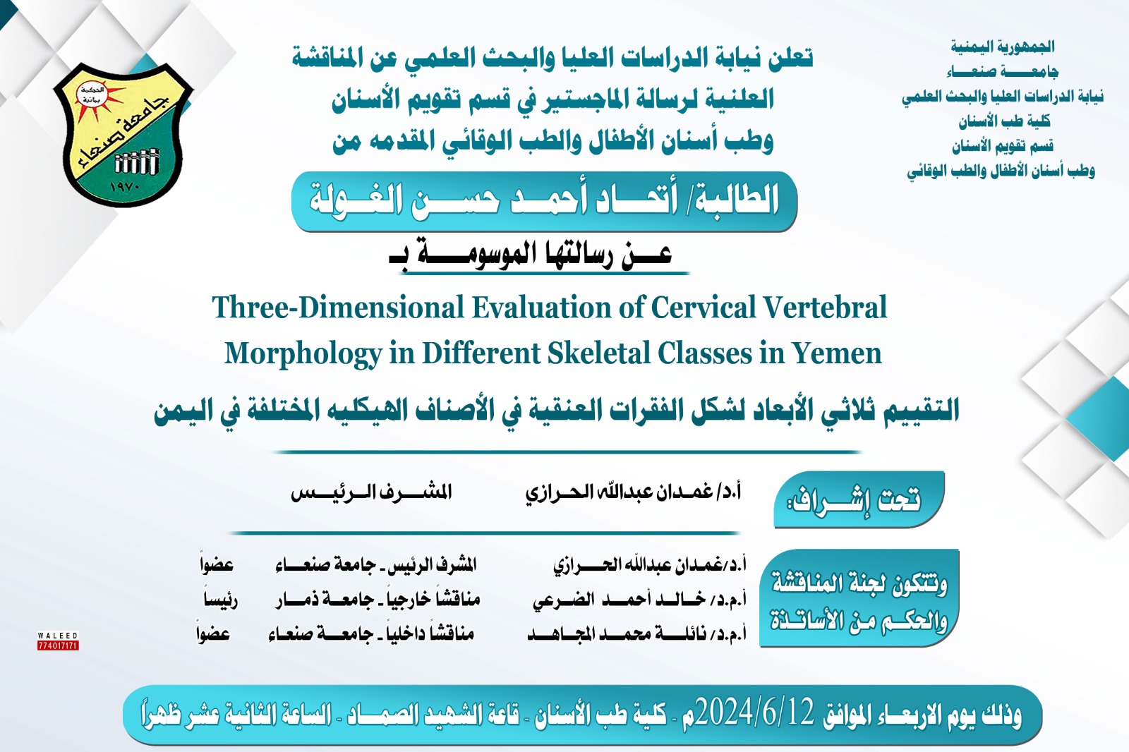 تعلن نيابة الدراسات العليا والبحث العلمي بجامعة صنعاء عن المناقشة العلنية المقدمة من: