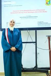 تاقشة الباحثة / فاطمة محمد عبدالله الرهمي الرسالة التي هي جزء من المتطلبات الحصول على درجة الماجستير في التعويضات السنية الثابته (تيجان وجسور) من قسم العلاج التحفظي كليه طب الاسنان بجامعة صنعاء عن رسالته الموسومة بتقييم دقة حواف الترميمات المؤقتة بين ثلاث تقنيات دراسه مخبريه