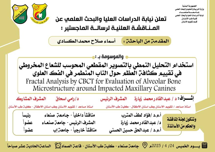 تعلن نيابة الدراسات العليا والبحث العلمي بجامعة صنعاء عن المناقشة العلنية المقدمة من الباحث أسماء صلاح محمد الكمادي Posted by جامعة صنعاء كلية الأسنان التصنيفات الأخبار Date أبريل 25, 2025 FacebookShare on XLinkedInWhatsAppEmailCopy Link جامعة صنعاء كلية الأسنان المقال السابق توزيع الطلاب لاختبارات الأتمتة ليوم الخميس الموافق 24-04-2025م أبريل 25, 2025 المقال التالي تعلن نيابة الدراسات العليا والبحث العلمي بجامعة صنعاء عن المناقشة العلنية المقدمة من الباحث إيثار عبدالله محمد نصار أبريل 25, 2025 You may also like الماجستير للباحثة هبة البعداني في جراحة الفم و الوجه والفكين 31 مارس, 2026 الماجستير للباحثة آسيا حويرث في قسم العلاج الترميمي والتجميلي من كلية طب الأسنان 24 فبراير, 2026 الماجستير للباحثة أمة السلام الماخذي من كلية طب الأسنان 23 فبراير, 2026