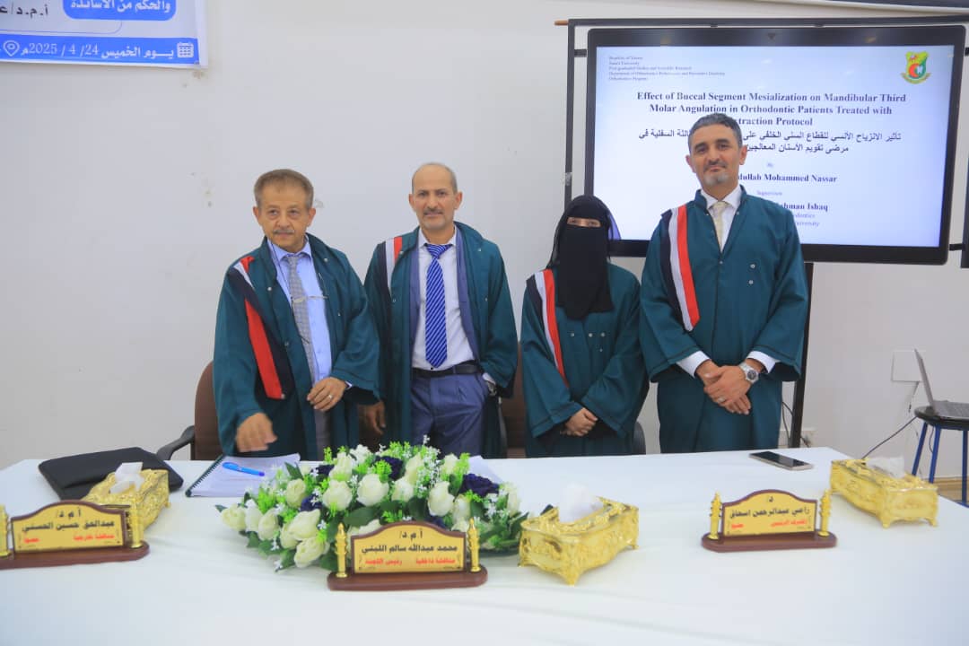 نالت الباحثة/ إيثار عبدالله محمد نصار درجة الماجستير بتقدير امتياز في قسم (تقويم الأسنان وطب أسنان الأطفال والطب الوقائي ) تخصص (تقويم أسنان وفكين ) كلية (طب الأسنان) بجامعة صنعاء عن رسالتها الموسومة بــــــ( تأثير الانزياح الأنسي للقطاع السني الخلفي على تزوي الرحى الثالثة السفلية في مرضى تقويم الأسنان المعالجين ببروتوكول القلع ) يوم الخميس 26 شوال 1446ه الموافق 24 /4 /2025م .