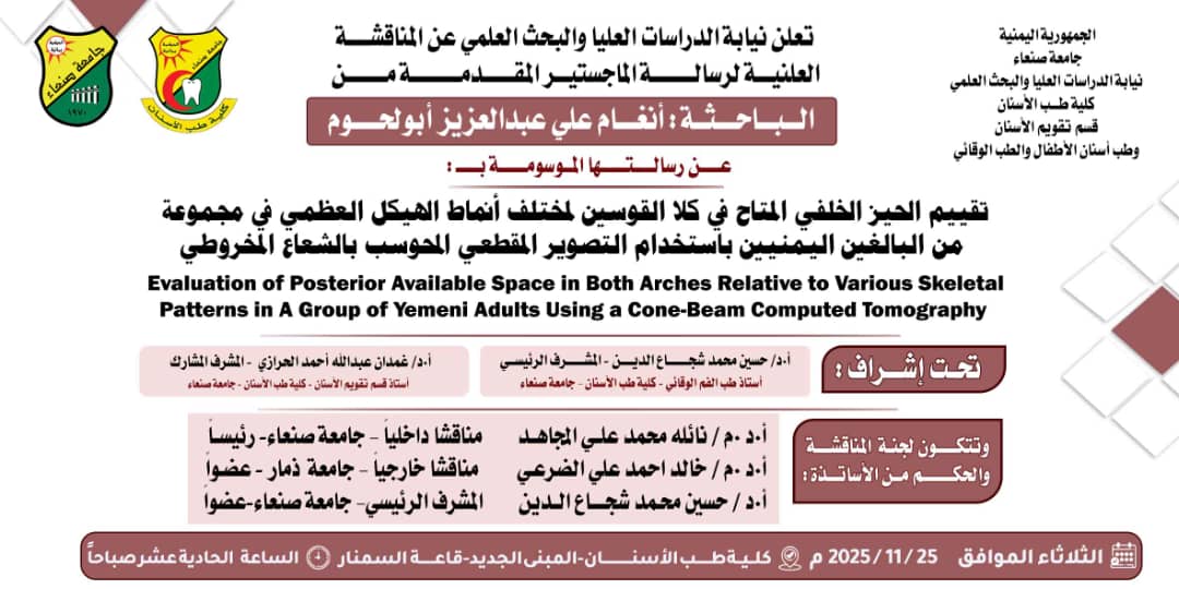 إعلان مناقشة الماجيستير للباحثة أنغام علي عبدالعزيز أبولحوم Posted by جامعة صنعاء كلية الأسنان التصنيفات الأخبار Date نوفمبر 24, 2025 FacebookShare on XLinkedInWhatsAppEmailCopy Link جامعة صنعاء كلية الأسنان المقال السابق إعلان مناقشة الماجيستير للباحث بدر حسن محمد قائد نوفمبر 24, 2025 المقال التالي دورة علمية بجامعة صنعاء حول أهمية علم الأدوية في طب الأسنان نوفمبر 24, 2025 You may also like كشوفات توزيع الطلاب والطالبات في المركز الامتحاني لامتحانات طلاب البكالوريوس لعدة مستويات يوم السبت الموافق 4/4 … 2 أبريل, 2026 الماجستير للباحثة هبة البعداني في جراحة الفم و الوجه والفكين 31 مارس, 2026 الماجستير للباحثة آسيا حويرث في قسم العلاج الترميمي والتجميلي من كلية طب الأسنان 24 فبراير, 2026