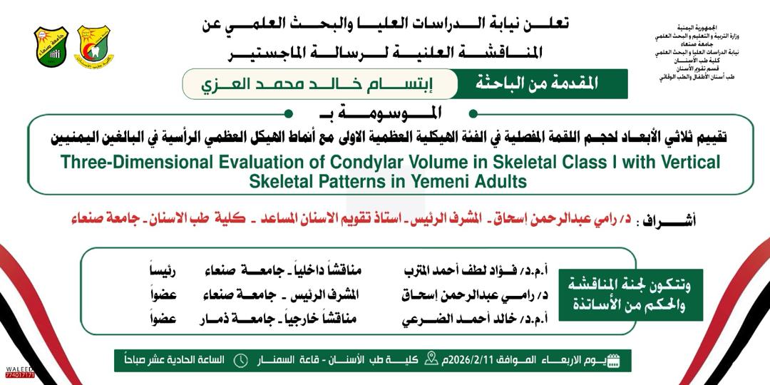 المناقشة العلنية لرسالة الماجستير المقدمة من الباحثة/ ابتسام خالد العزي Posted by جامعة صنعاء كلية الأسنان التصنيفات الأخبار Date فبراير 10, 2026 FacebookShare on XLinkedInWhatsAppEmailCopy Link جامعة صنعاء كلية الأسنان المقال السابق كشف توزيع الطلاب والطالبات في المركز الامتحاني لامتحان يوم الأثنين الموافق 2/9 لمادة الوقاية وطب الاسنان المجتمعي 1 ماجستير طب أسنان الاطفال السنة الاولى… الفترة الخامسة فبراير 10, 2026 المقال التالي الماجستير للباحثة أماني لطف الثلايا من كلية طب الأسنان فبراير 10, 2026 You may also like مجلس كلية طب الأسنان بجامعة صنعاء يعقد اجتماعه الدوري لمناقشة أوضاع الطلاب وتطوير العملية الأكاديمية 16 فبراير, 2026 المناقشة العلنية لرسالة الماجستير المقدمة من الباحثة/ آسيا نديم حويرث 15 فبراير, 2026 الماجستير للباحثة إبتسام العزي من كلية طب الأسنان 14 فبراير, 2026