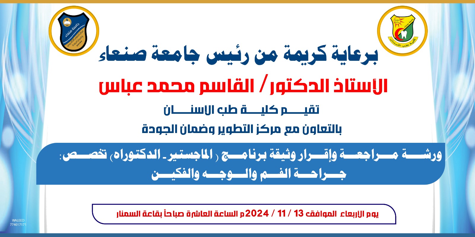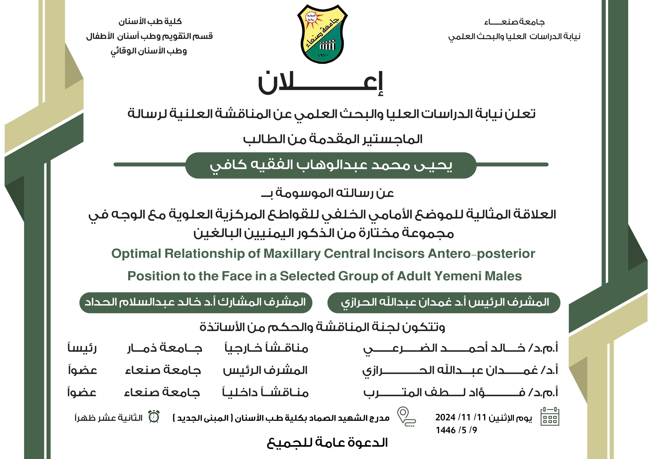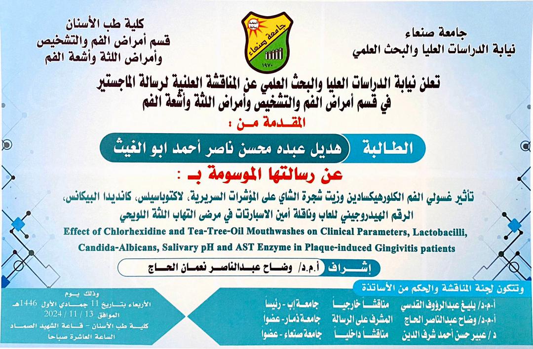 نال الطالب جمال حزام ناجي النمير درجة الماجستير بمعدل ٩٣ بتقدير “امتياز” في قسم (تقويم الأسنان وطب أسنان الأطفال والطب الوقائي) تخصص (طب أسنان الأطفال) كلية (طب الأسنان) بجامعة صنعاء، عن رسالته الموسومة بـ”تقييم التموضع النسبي لثقبة الفك السفلي لدى …