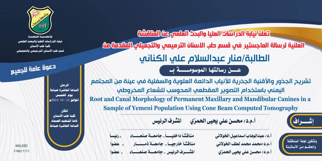نالت الطالبة/ منار عبد السلام علي الكناني درجة الماجستير بتقدير ممتاز ودرجة ٩٥ في قسم طب الأسنان تخصص ترميم وتجميل الأسنان (مداواة لبية) كلية طب الأسنان بجامعة صنعاء عن رسالتها الموسومة تشريح الجذور والأقنية الجذرية للأنياب الدائمة العلوية والسفلية في …