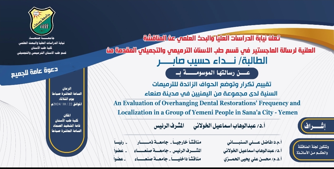 تعلن نيابة الدراسات العليا والبحث العلمي بجامعة صنعاء عن عقد المناقشة العلنية لرسالة الماجستير المقدمة من الباحثة سامية حسن قائد دماج ، قسم تقويم الأسنان بكلية طب الأسنان. وذلك حول رسالتها الموسومة بـ: “مقارنة بين روابط الألصاق الباعثة للفلورايد والروابط …