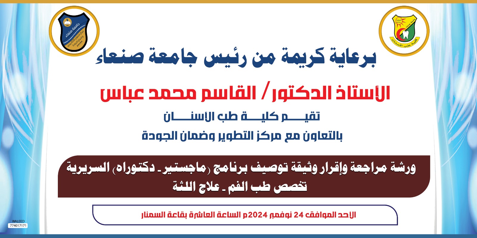 برعاية رئيس جامعة صنعاء الاستاذ الدكتور القاسم محمد عباس أقامت كلية طب الأسنان وبالتعاون مع مركز التطوير وضمان الجودة بالجامعة يوم الأربعاء 12 جماد الاول 1443ه الموافق 13 نوفمبر 2024م ورشة العمل الخاصة بمراجعة وإقرار وثيقة برنامج (الماجستير- الدكتوراة) تخصص …