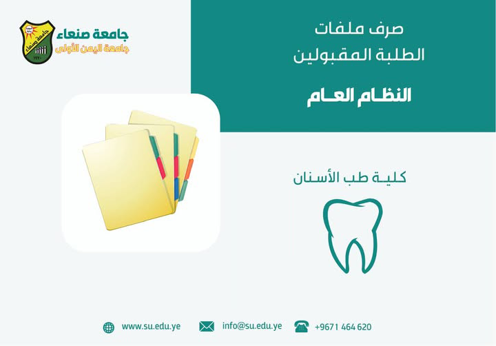 إعلان هام للطلاب المقبولين في طب وجراحة الفم والأسنان (نظام عام) تعلن نيابة رئاسة الجامعة لشؤون الطلاب بجامعة صنعاء عن بدء عملية صرف ملفات الطلاب المقبولين في كلية طب الأسنان تخصص (طب وجراحة الفم والأسنان) – نظام عام للعام الدراسي …